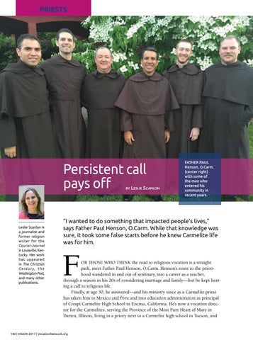 OR THOSE WHO THINK the road to religious vocation is a straight path, meet Father Paul Henson, O.Carm. Henson’s route to the priesthood wandered in and out of seminary, into a career as a teacher, through a season in his 20s of considering marriage and family—but he kept hearing a call to religious life. Finally, at age 30, he answered—and his ministry since as a Carmelite priest has taken him to Mexico and Peru and into education administration as principal of Crespi Carmelite High School in Encino, California. He’s now a vocation director for the Carmelites, serving the Province of the Most Pure Heart of Mary in Darien, Illinois, living in a priory next to a Carmelite high school in Tucson, and