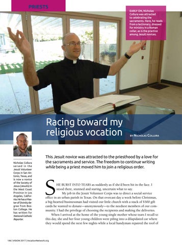 EARLY ON, Nicholas Collura was attracted to celebrating the sacraments. Here, he reads from a lectionary, dressed for ministry in a Roman collar, as is the practice among Jesuit novices.