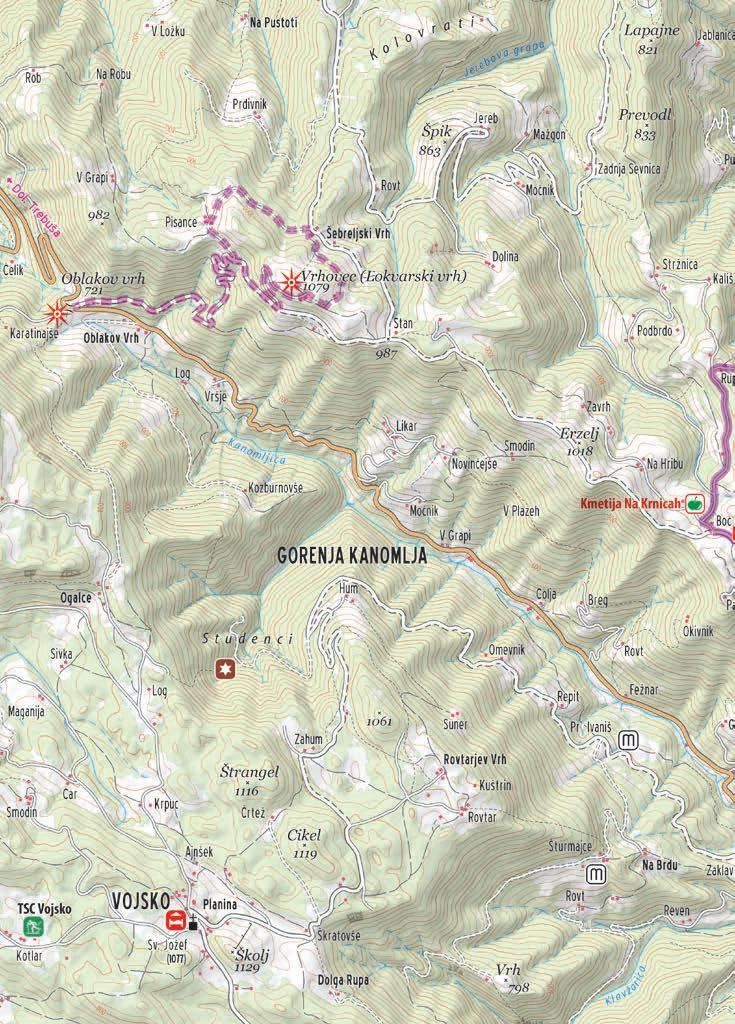 Dolžina: 9 km Čas hoje: 3 h 45 min Višinska razlika: 364 m Zahtevnost: nezahtevna pohodna pot Na Oblakovem vrhu se nahaja prelomna cona znamenitega idrijskega preloma, enega najmočnejših in najpomembnejših prelomov v območju Južnih Alp. Z vrha Vrhovca oz. Lokvarskega vrha (1.079 m), na katerem stoji panoramska tabla, se nam odpre lep pogled po Šebreljski planoti, Trnovskem gozdu, Idrijskem, Cerkljanskem in Škofjeloškem hribovju ter ob lepi vidljivosti vse do Julijskih Alp.