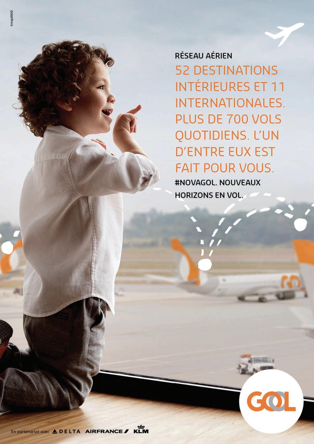 Depuis Novembre 2017, Air France-KLM est le représentant commercial de la compagnie brésilienne en France ainsi qu’à Monaco. Acteur incontournable du marché brésilien avec une otte de 120 avions, GOL détient 36% de parts de marché au Brésil et opère plus de 700 vols quotidiens. Elle est aussi la 1ère compagnie aérienne brésilienne en termes de ponctualité. Attentive au confort de ses passagers, elle proposera le wi sur l’ensemble de sa otte n 2018. Les avantages pour nos clients sont multiples : une réservation unique et simpli ée, la possibilité de voyager avec deux bagages dont le suivi est assuré avec ou sans correspondance en Amérique Latine, l’opportunité de cumuler et dépenser ses miles sur les trois compagnies : Air France, KLM et GOL. Cet accord nous permet également d’améliorer notre o re commerciale par la vente de l’intégralité des vols intérieurs au Brésil.