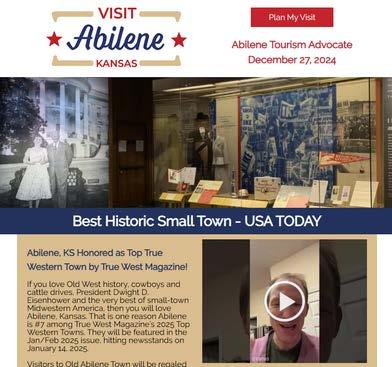 The Abilene Convention & Visitors Bureau produces an electronic newsletter celebrating Abilene. It is sent to individuals who request information about the community and is also shared on social media and on the CVB website at AbileneKansas.org/newsletter.