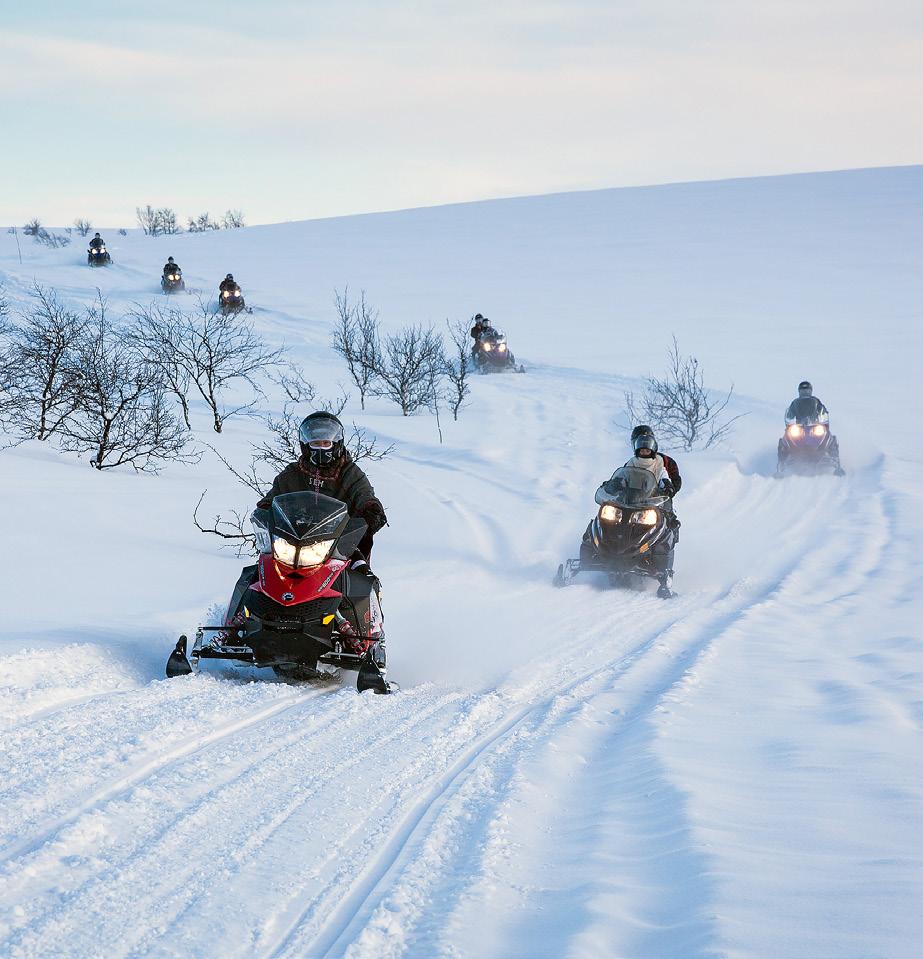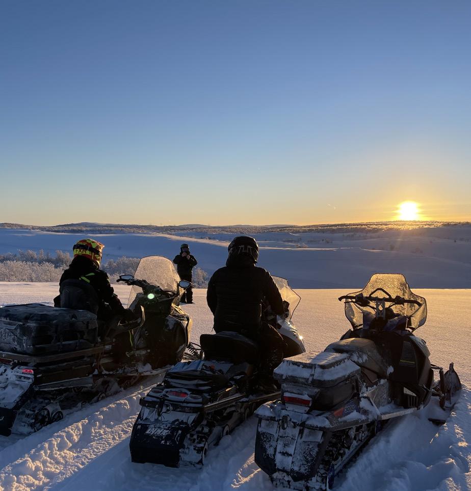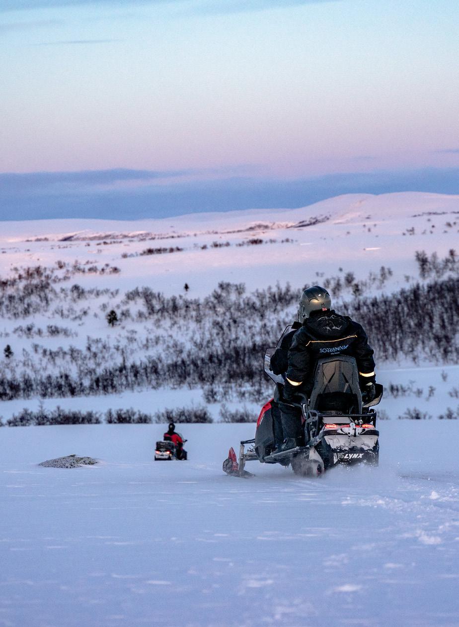 Explore arctic nature by snowmobile. Our organized tours take you to the mountains where you can experience the arctic light or the powerful northern lights in the evening. The tours can vary based on the guests' wishes, and the duration ranges from 5-7 hours. A shorter trip to the local viewpoint or a leisurely trip to the local mountain lodge, only accessible by snowmobile for a lovely lunch or dinner.