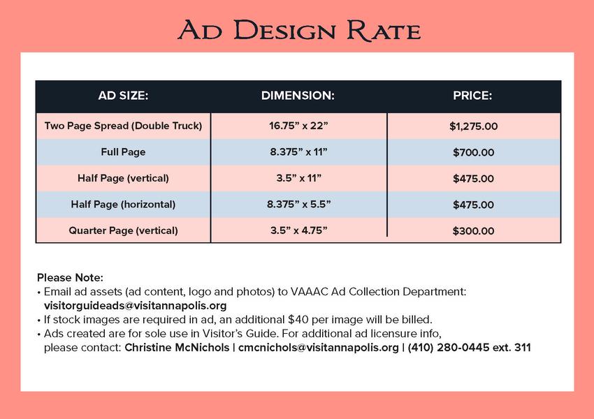 E-mail advertising assets (ad content, logo, and photos) to VAAAC Ad Layout (VisitorGuideAds@VisitAnnapolis org)