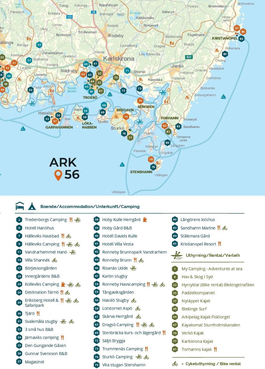 ARK56 ist ein Netzwerk von Küstenwegen, auf denen du mit dem Fahrrad, zu Fuß, im Kajak oder mit dem Boot auf nachhaltige Weise das Biosphärengebiet Blekinge Archipel erkunden kannst. Entlang der Wege gibt es sogenannte Knotenpunkte mit Service und der Möglichkeit, das Fortbewegungsmittel zu wechseln.