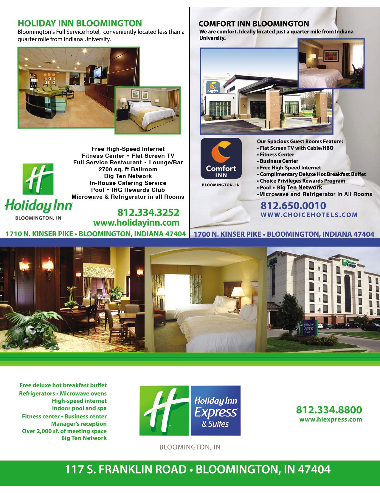 Conveniently located walking distance to resaurants and shopping Spacious, Modern, Suite rooms Free Breakfast Fitness Center Business Center Indoor Pool and Spa 24 Hour Giftshop Bloomington’s Newest Hotel! 812-727-0205 www.LQ.com 3380 W Runkle Way Bloomington, IN 47404 Complimentary Hot Breakfast Buffet Free High-Speed Internet Indoor Pool and Spa Fitness Center Business Center Fridge, Microwave and Coffee Maker in Every Room Balcony Rooms with a Beautiful View Newly renovated plus great location for Hoosiers alumni and groups. Steps away from Bloomington nightlife and a brief walk to campus. 245 N College Avenue Bloomington, IN 47403 T: 812-331-1335 Bloomington