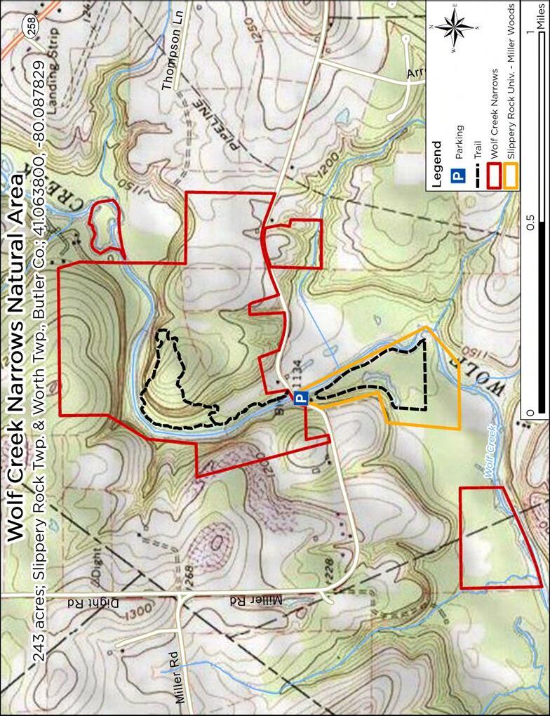 Please note: The parking area is located on the Miller Woods tract, owned and managed by Slippery Rock University. The southern parcel of the Natural Area is accessible only from the creek.