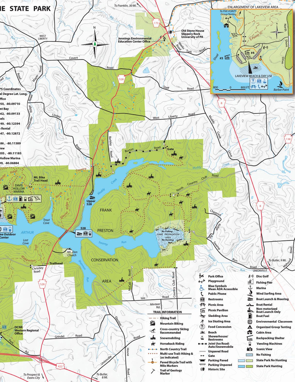 Recreational activities (see inside for details): Hiking, wildlife watching, hunting, fishing Directions : From the Slippery Rock exit off I -79, go east on Rt. 108 to Slippery Rock. At the light in town, turn left on Rt. 258. Go one block, turn left on W. Water St., and follow it for approx. 2 miles (W. Water St. becomes Miller Rd.) until it crosses a bridge over Wolf Creek. Cross the bridge and turn left into a small parking area at the head of a dirt lane. Walk back across the bridge, and the trailhead is on the left. Please use caution and watch for traffic along the road. Please note: The parking area is located on the Miller Woods tract, owned and managed by Slippery Rock University. The southern parcel of the Natural Area is accessible only from the creek.