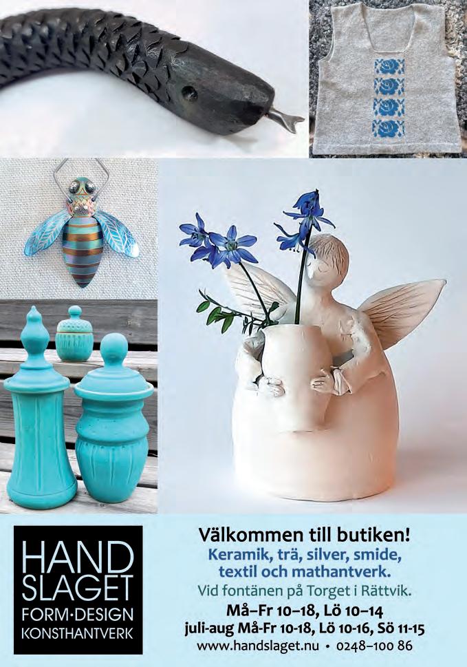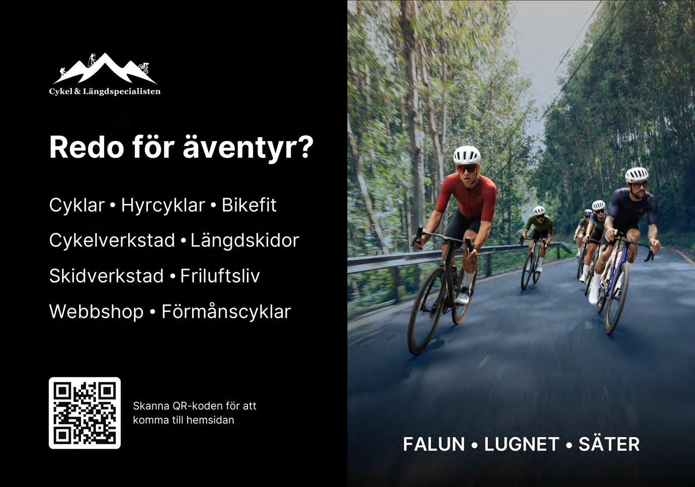 TRYCK Bold Printing Mitt Vi ansvarar ej för åsikter framförda av enskilda skribenter och reserverar oss för eventuella ändringar och tryckfel. Papperet uppfyller svanenkriterierna och är tryckt på svanenlicensierat tryckeri. facebook.com/visitdalarna @visitdalarnasweden #visitdalarna visitdalarna.se 4 Aktuellt just nu 8 Älvdalen 10 Malung-Sälen 12 Orsa 13 Vandringstips genom hela Dalarna 16 Mora 19 Sveriges bästa cykling 22 Leksand 23 Rättvik 26 Vansbro 27 Gagnef 28 Skvallra i Dalarna 30 Falun 31 Borlänge 32 Säter 34 Hedemora 35 Avesta 36 Golfa i Dalarna 38 Ludvika 40 Smedjebacken 42 Min bild av Dalarna 46 Evenemang 48 Utställningar 49 Händer i Dalarna 56 Infopoints
