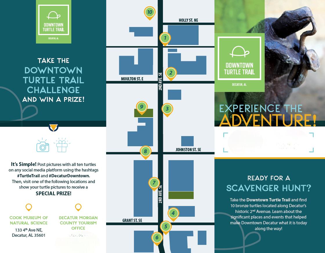 It’s Simple! Post pictures with all eleven turtles on any social media platform using the hashtags #TurtleTrail, #DecaturDowntown, and #VisitDecaturAL. Then, visit one of the following locations and show your pictures to receive a SPECIAL PRIZE! Find the Bonus Turtle for an Extra Decatur Sticker!