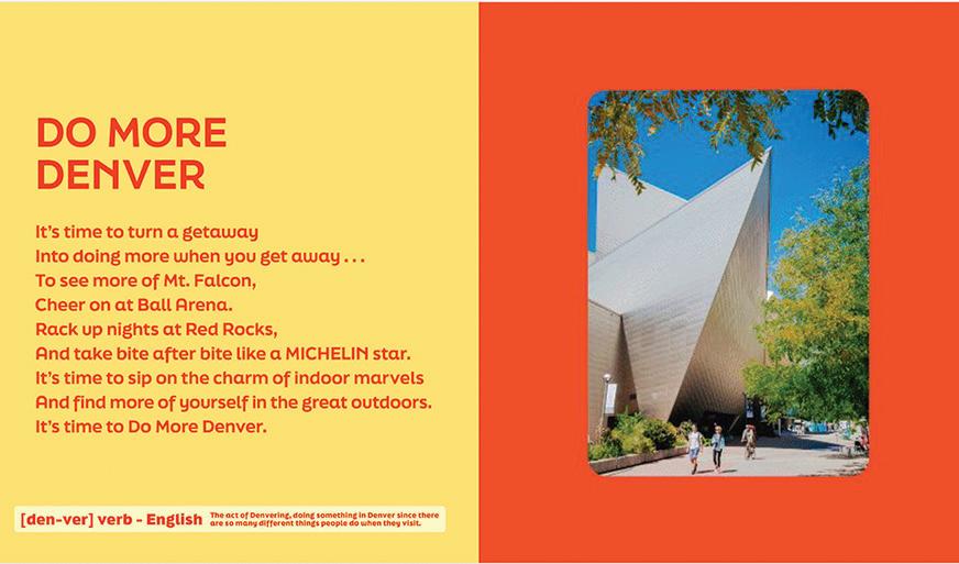 In September, MEET Denver (Meet. Experience. Enjoy. Tell.) welcomed meeting planners from across the nation, introducing them to The Mile High City’s vibrant hospitality. The 2024 program included a tour of the new Bluebird Ballroom and Terrace, an inspiring keynote by Ryan Harris—Super Bowl Champion, Keynote Speaker, AwardWinning Broadcaster, and Bestselling Author—and engaging activities such as a Downtown Denver E-Bike Tour, Downtown hotel and venue tours and a RiNo Microbrew and Street Art Tour. Planners also enjoyed a behind-the-scenes tour of Red Rocks Amphitheater, followed by lunch at The Fort restaurant and a Colorado Rockies vs. Los Angeles Dodgers baseball game with post-game fireworks. Receptions at The Denver Botanic Gardens and Meow Wolf showcased Denver’s unique attractions, while a dedicated Hotel Showcase at The Brighton featured nearly 60 metroarea hotels. The trip was attended by over 60 planners, collectively representing approximately $32 million in potential and confirmed business for the city.