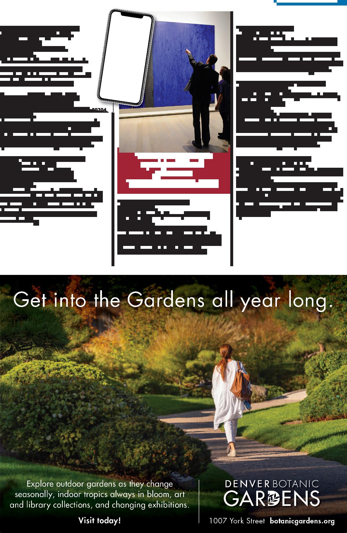Pg. 25 (clockwise from top): Denver Botanic Gardens; Confluence Park; Washington Park by Rich Grant; Civic Center Park by Jeremy Janus/Shutterstock; Cheesman Park; Denver Botanic Gardens; Aerial view of City Park by Jacob Boomsma/Shutterstock.