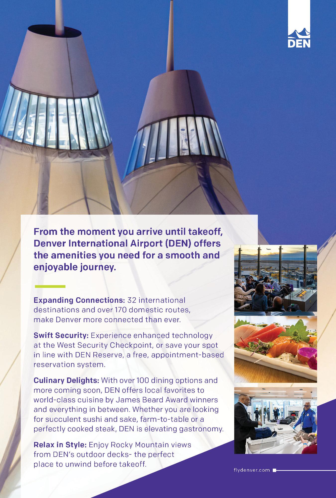 Flourishing alongside Denver’s arts and music scene is the city’s culinary offerings, featuring James Beard Awardwinning chefs, Michelin-acclaimed eateries, gourmet marketplaces and a focus on locally sourced cuisine. Our dynamic craft beverage scene includes world-renowned craft breweries, distilleries and urban wineries. Thanks to our temperate climate, many of our dining and drinking establishments have year-round outdoor spaces and rooftop patios that illuminate the ever-present mountain views.