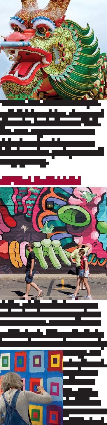 Pg. 37 (clockwise from top): Chinese New Year dragon head by ngorkapong/ Shutterstock; Gothic Theatre; Balefire Goods in Olde Town Arvada; Sloans Lake by Jeremy Janus/Shutterstock; Edgewater Public Market; Littleton; 40 West Art District Gallery and MuralFest.