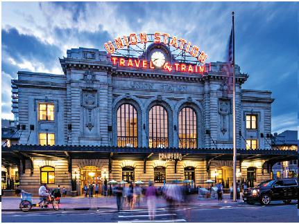 Pg. 99: Denver Union Station by Scott Dressel-Martin. Inset photos (left to right): 1-70 corridor to the mountains by Rich Grant; Denver Union Station interior by Rich Grant; Denver International Airport; Light Rail at Colorado Convention Center by Stevie Crecelius.