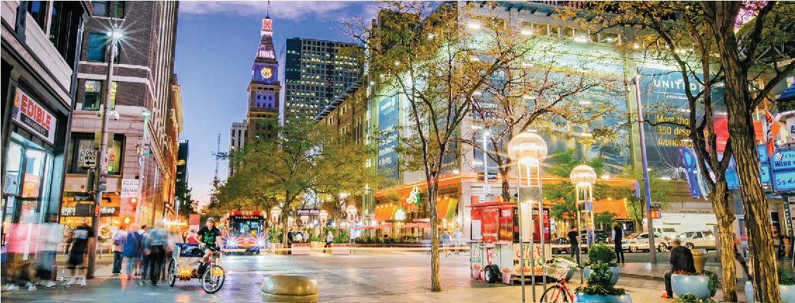Pg. 26 (clockwise from top): 16th Street Mall by TruBlu Images; Downtown Denver Rink at Skyline Park; Free 16th Street Mall Shuttle by TruBlu Images; 16th Street Mall by Jensen Sutta.