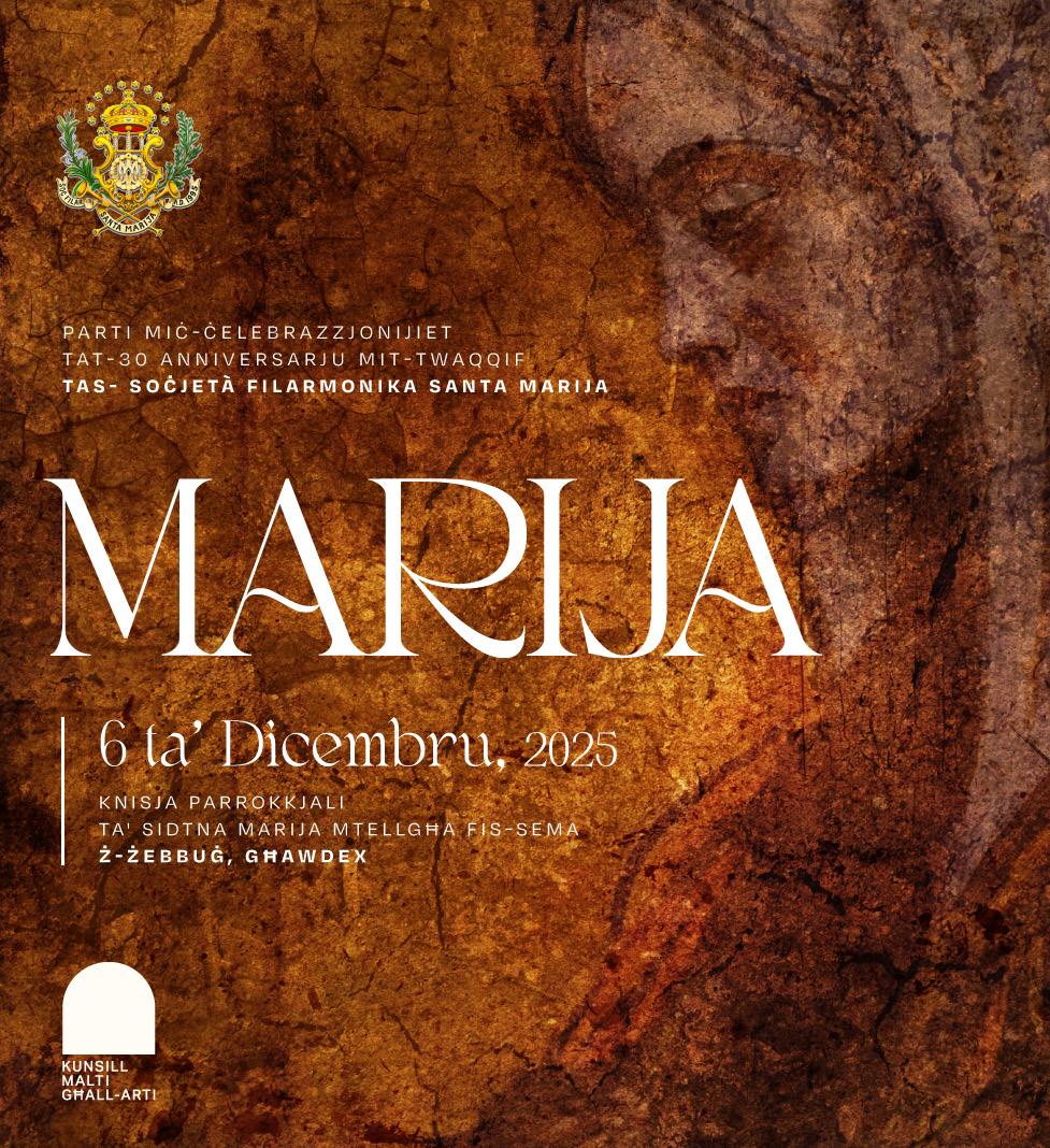 part of its 30th anniversary celebrations, Santa Marija Philharmonic Society presents a production mainly featuring the Marija Band, accompanied by renowned vocalists, the Żebbuġ Parish choirs, and an ensemble of orchestral elements. Written by Spiritual Director Mgr Noel Saliba and composed and conducted by Asst Music Director Mro Franco Cefai, this production explores the most significant stages in the life of St Mary, patroness of Żebbuġ, weaving together faith, tradition, and community spirit in an unforgettable musical tapestry. Free admission for all, with a special commemmorative booklet available for patrons.