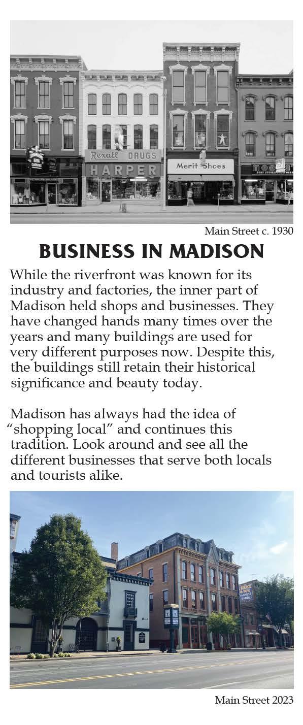 While the riverfront was known for its industry and factories, the inner part of Madison held shops and businesses. They have changed hands many times over the years and many buildings are used for very different purposes now. Despite this, the buildings still retain their historical significance and beauty today.