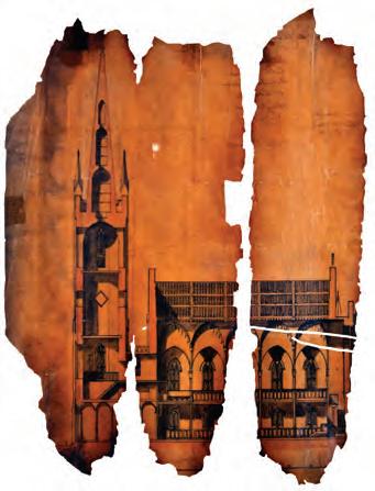 The drawings consisted of charred fragments of original ink and water colour plans on tracing paper. The plans had been damaged by fire in the 1950s and then had been rolled for storage.