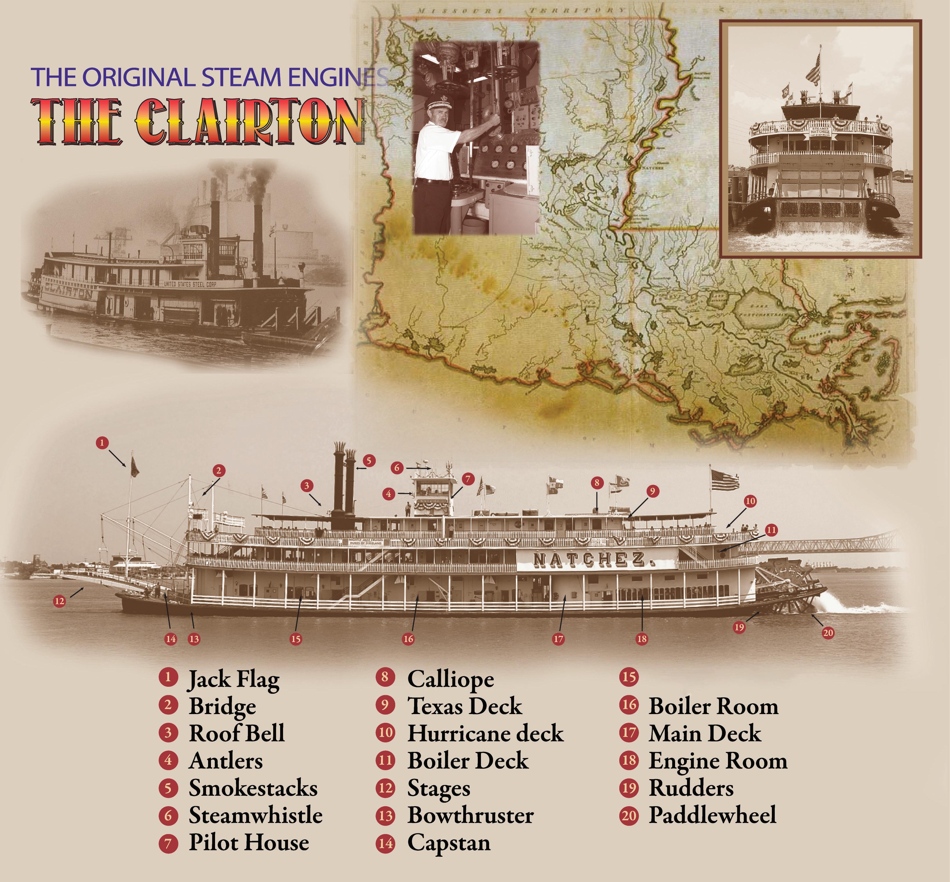 The NATCHEZ resembles the old Ohio River sternwheelers VIRGINIA and HUDSON in her profile and layout. Her powerful steam engines were built for the U.S. Steel Corporation’s sternwheeler CLAIRTON in 1925. Her genuine copper and steel steam whistle is a treasured antique. Her copper bell, inlaid with 250 silver dollars to produce a purer tone, once graced the steamer J.D. AYRES. Her 32 note steam calliope was custom-crafted and modeled after the music makers of the Gilded Age (1877-1920).