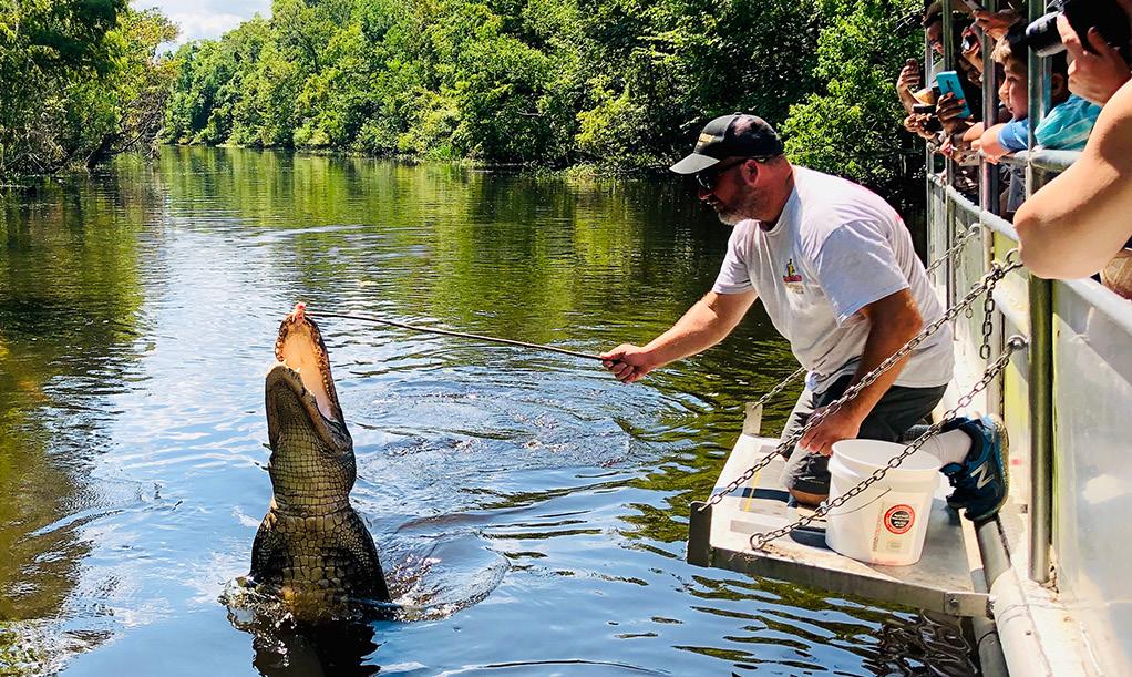 Local boat captains who share the Cajun culture of fishing, hunting & trapping Large alligators leaping up for a snack