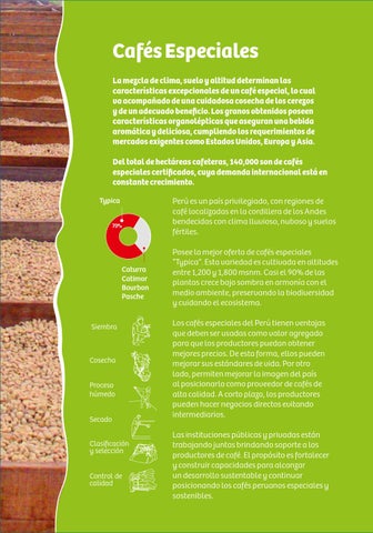 Perú es un país privilegiado, con regiones de café localizadas en la cordillera de los Andes bendecidas con clima lluvioso, nuboso y suelos fértiles. Posee la mejor oferta de cafés especiales “Typica”. Esta variedad es cultivada en altitudes entre 1,200 y 1,800 msnm. Casi el 90% de las plantas crece bajo sombra en armonía con el medio ambiente, preservando la biodiversidad y cuidando el ecosistema. Los cafés especiales del Perú tienen ventajas que deben ser usadas como valor agregado para que los productores puedan obtener mejores precios. De esta forma, ellos pueden mejorar sus estándares de vida. Por otro lado, permiten mejorar la imagen del país al posicionarlo como proveedor de cafés de alta calidad. A corto plazo, los productores pueden hacer negocios directos evitando intermediarios. Las instituciones públicas y privadas están trabajando juntas brindando soporte a los productores de café. El propósito es fortalecer y construir capacidades para alcanzar un desarrollo sustentable y continuar posicionando los cafés peruanos especiales y sostenibles.
