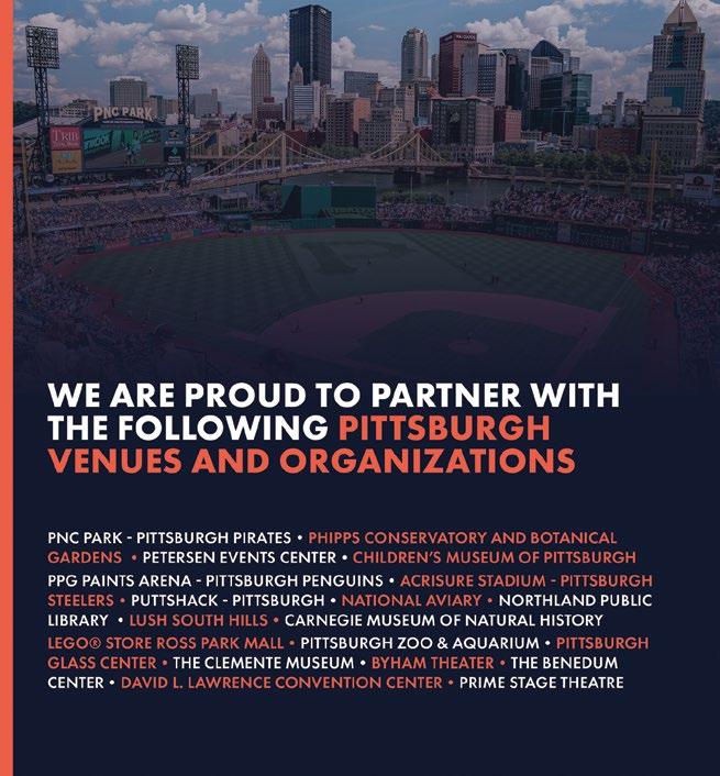 The Insider’s Guide is published by the Greater Pittsburgh Convention & Visitors Bureau™. Listings and advertisements are based on information provided by individual companies. VisitPITTSBURGH® is not responsible for the contents of listings. Every effort is made to ensure the accuracy of this publication. Events, programs, prices and amenities are subject to change. Information is believed to be accurate at the time of printing.