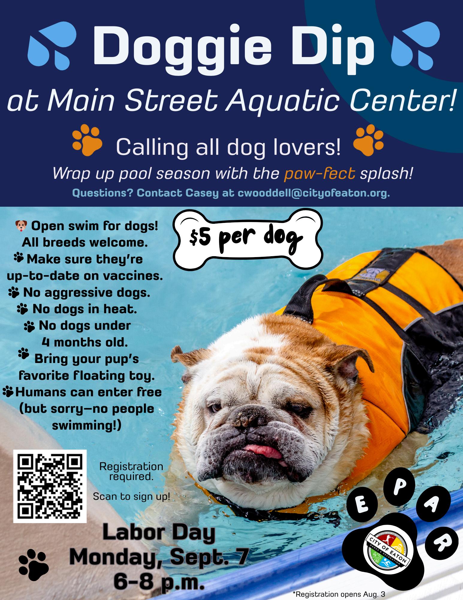Wrap up pool season with the paw-fect splash at this special evening swim for dogs at Main Street Aquatic Center