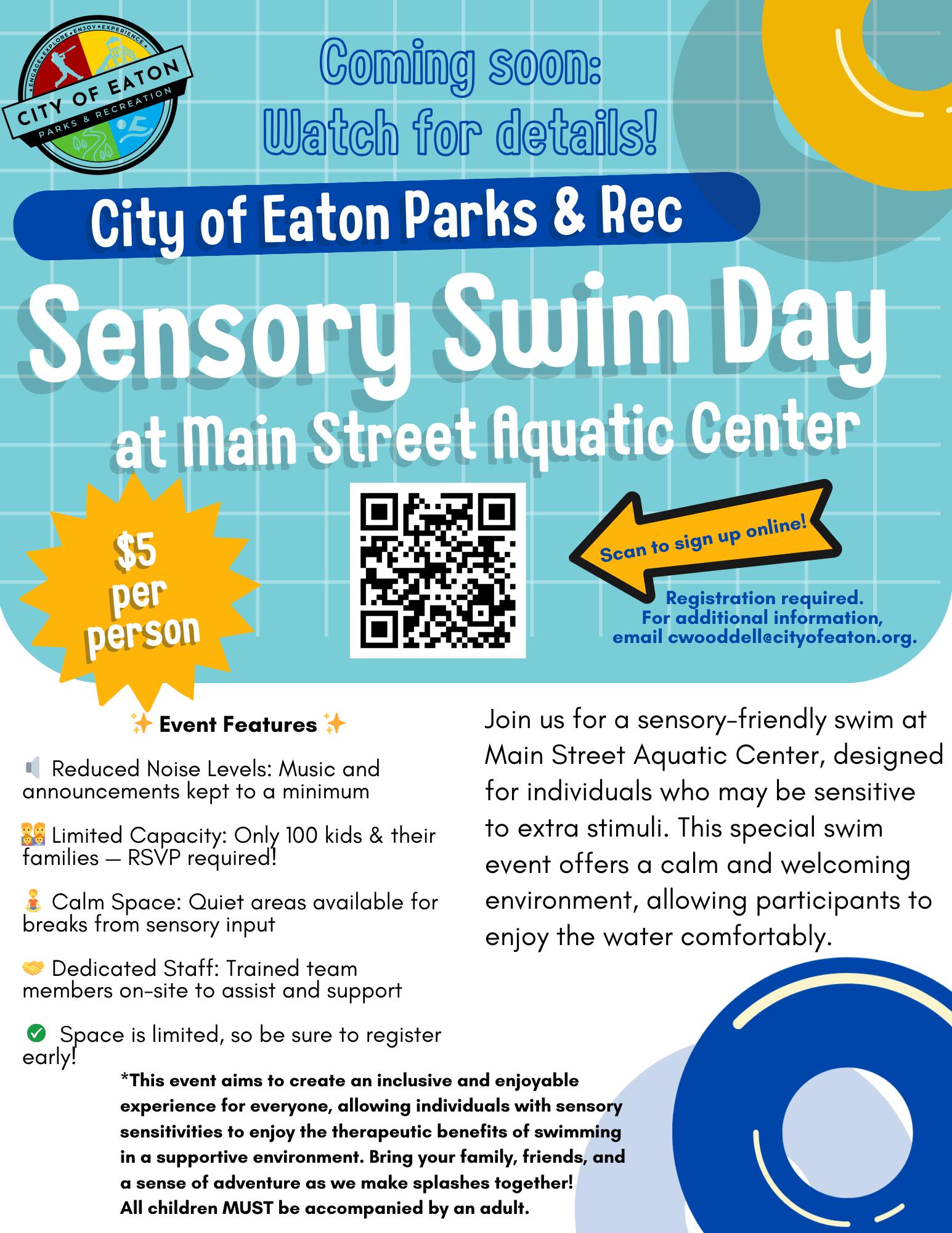 A sensory-friendly swim at Main Street Aquatic Center, designed for individuals who may be sensitive to extra stimuli