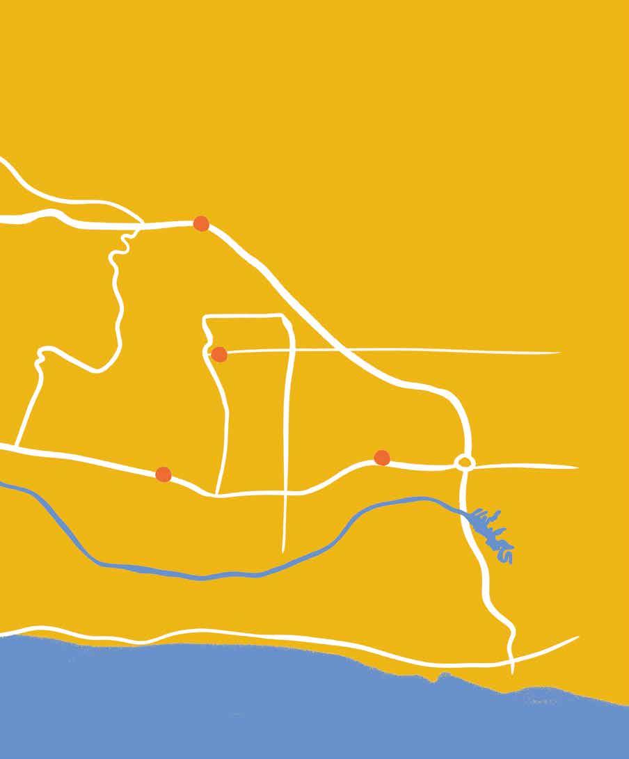 BUELLTON (PAGE 48) Just a few miles west of Solvang, Buellton surprises visitors with its urban tasting rooms, craft distilleries and a flagship brewery on Industrial Way. The town’s dining options are plentiful and range from oak-grilled steaks to farm-to-table fare and wood-fired pizzas. It’s a culinary destination with a laid-back vibe where local ingredients take center stage.