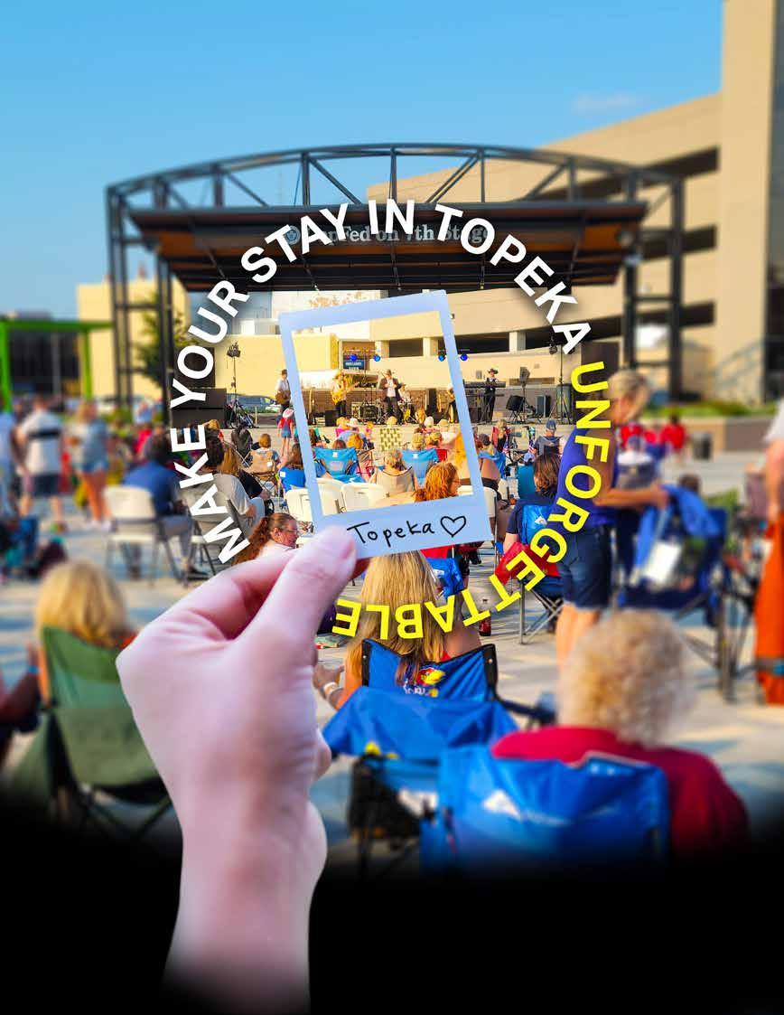 All information is accurate at the time of printing. However, Visit Topeka does not assume responsibility for accuracy. All rights reserved. No part of this publication may be reproduced, stored in a retrieval system or transmitted in any form or by any means, electronic, mechanical, photocopying, recording or otherwise, without prior consent of Visit Topeka. User Generated Content: Several photos in this guide were taken by Topekans and visitors and printed with permission.