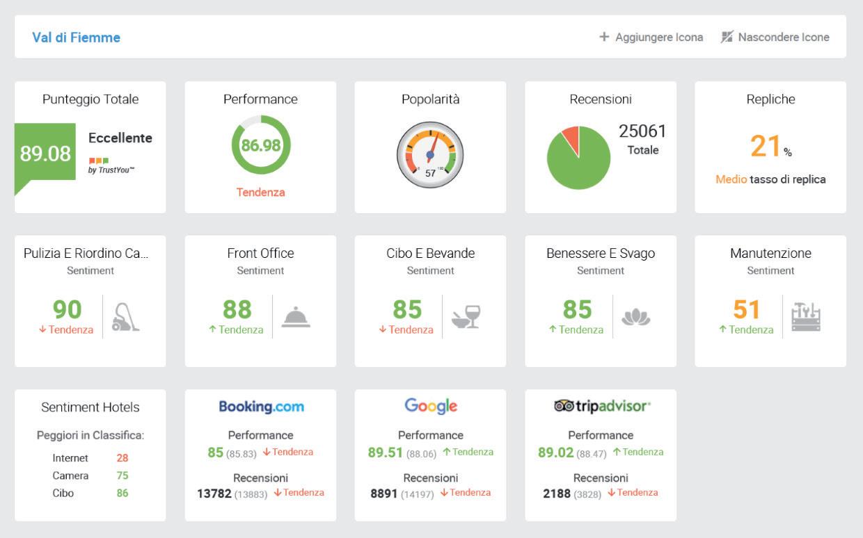L’indice di reputazione che aggrega le recensioni della tua struttura presenti sul web e attribuisce un punteggio con valore da 1 a 5 visualizzabile tramite un widget dinamico.