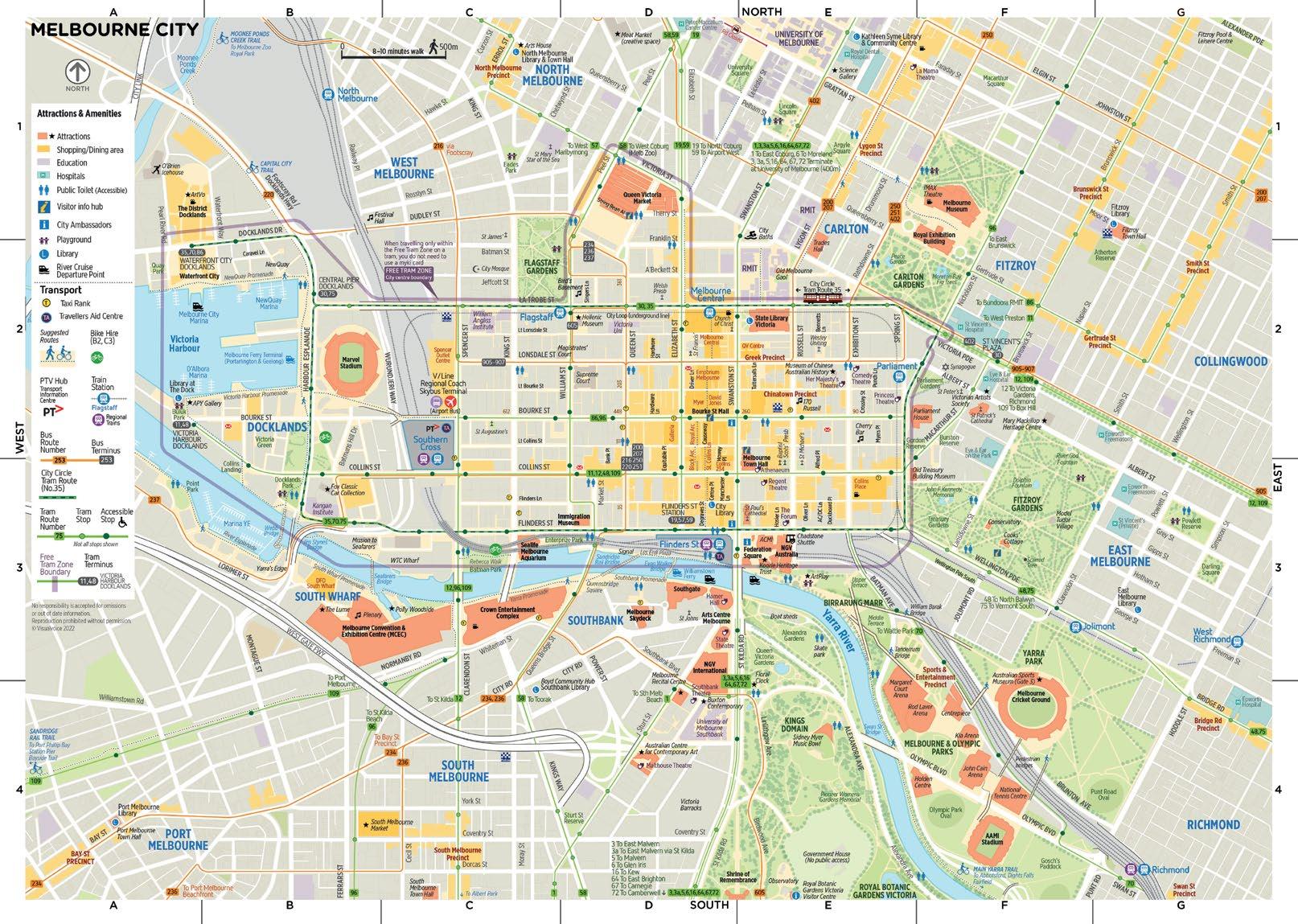 The city’s Free Tram Zone includes the city centre and extends from Queen Victoria Market to Docklands, including Spring Street, Flinders Street Station and Federation Square (Free Tram Zone shown on Melbourne City Map and Melbourne tram network map).