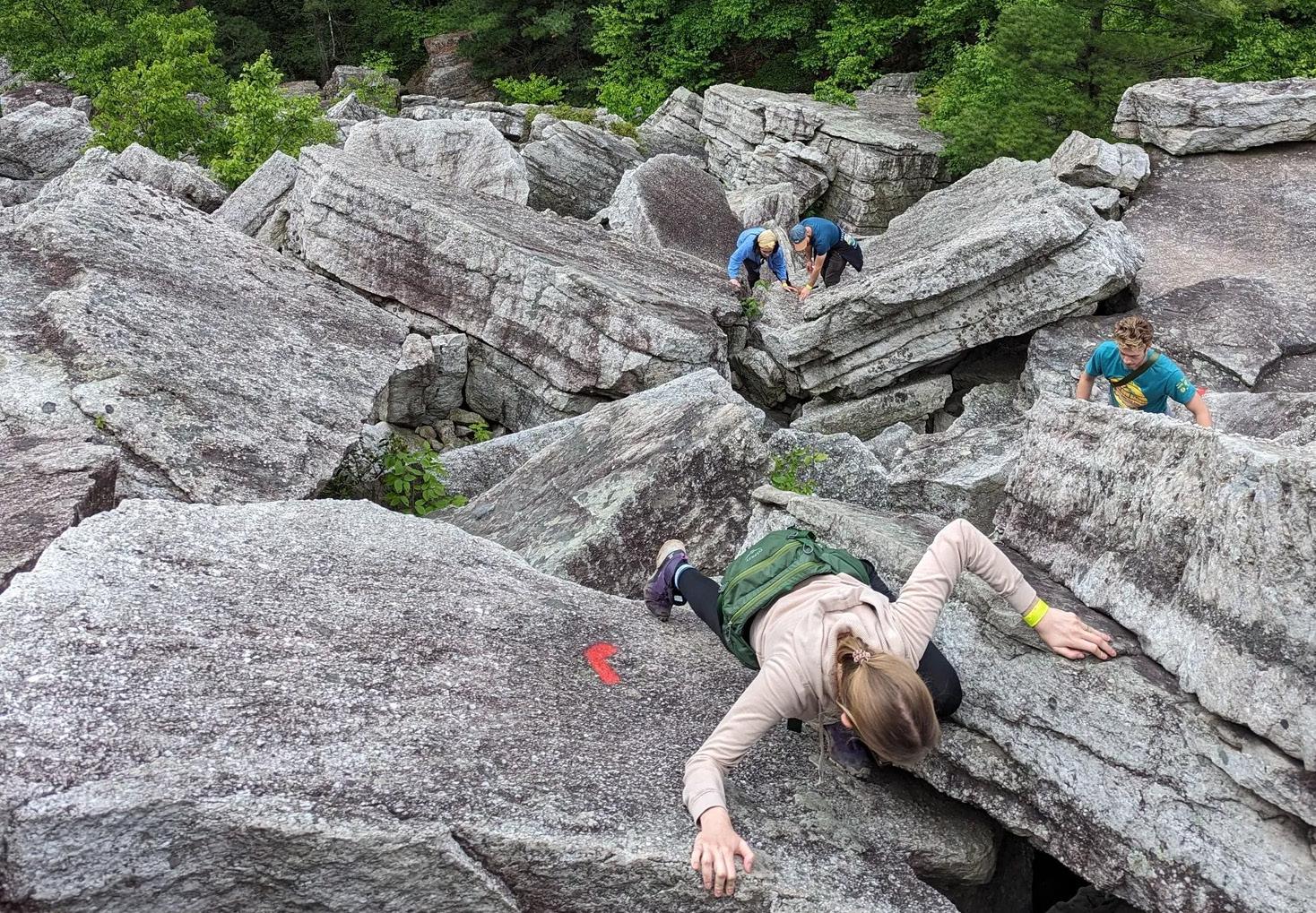 You’re heading upward through a talus pile, the rocks that accumulate at the base of a cliff. Be sure to look for and follow the yellow-blazed rocks to stay on track. They’ll lead you onward and upward to the climb-able notch in the cliff face that takes you to the top.