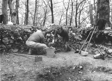 Archeological research on Ajdna in 1979, cleaning walls; Andrej Valič (left) and Janez Meterc