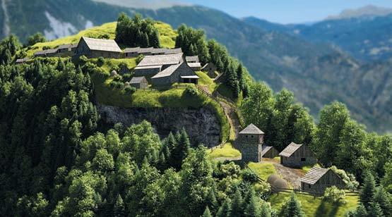 Virtualna rekonstrukcija antične vasice na Ajdni, izdelana na podlagi izsledkov dolgoletnih arheoloških raziskav.