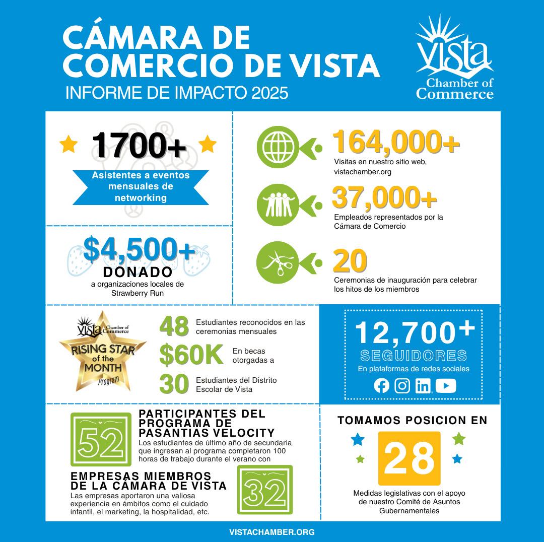 En la Cámara de Comercio de Vista, vemos el poder de la gratitud en acción a diario. Lo vemos cuando el propietario de un negocio asesora a un estudiante a través de nuestro Programa de Pasantías Velocity, ayudando a formar la próxima generación de líderes. Lo vemos cuando los socios patrocinan una beca para estudiantes de Rising Star o cuando los voluntarios dedican su tiempo a eventos que unen a nuestra comunidad, como el Festival de la Fresa de Vista, el Desfile de Navidad o nuestra nueva celebración de Fiestas Patrias. Cada uno de estos momentos refleja el espíritu de Vista: vecinos ayudándose entre ellos, negocios apoyándose mutuamente y un orgullo compartido por nuestra comunidad.