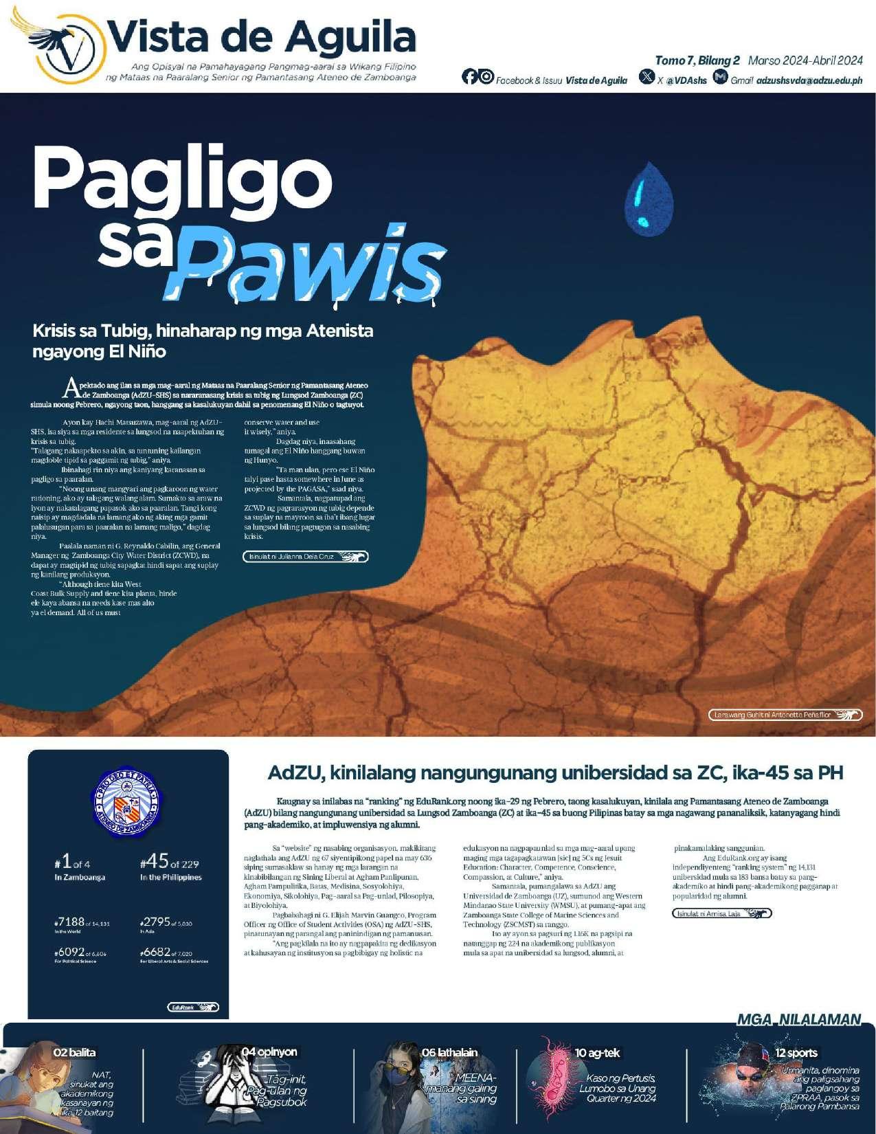 TUKLAS: Sa tanaw at pananaw ng buwan ng Marso at Abril 2024, saksihan ang kasaysayan at kuwento ng mga pangyayari sa pamayanan ng AdZU-SHS at ang iilan pa ay mga okurensiyang naganap sa labas nito. Kaya naman, halina't magbalik-tanaw sa iba't ibang aspeto ng buhay sa pamamagitan ng pinal na isyu ng kalatas-balita para sa tomo 7 na handog ng Vista de Aguila.