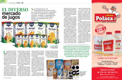 a regenerar los tejidos de la piel. En cambio, Lácteos San Antonio tiene presencia en el mercado con su marca Nutri; Ajecuador con Pulp y Cifrut; Tesalia con Jugazzo; Quicornac con Sunny, y Olympic Juice con Orangine. Todos ellos aumentan la oferta de jugos y néctares en las tiendas y supermercados del país. Según el estudio de la Flacso, dentro de los insumos nacionales para la elaboración de jugos y conservas, el más importante corresponde a las pulpas con un 35 por ciento; seguido por los envases y envolturas con un 23 por ciento y los aditivos (azúcar, saborizantes, esencias y almidones) con un 16 por ciento. Estos productos también son atractivos por su presentación en tetra pak o en botellas de vidrio y plástico, cada uno cumple con las nuevas disposiciones como la colocación del semáforo en la etiqueta y exponen todos sus componentes.
