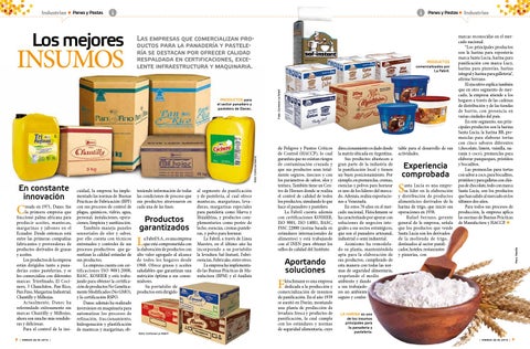marcas reconocidas en el mercado nacional. “Los principales productos son la harina para repostería marca Santa Lucía, harina para panificación con marca Lucy, harina para pizzerías, harina integral y harina para galletería”, afirma Serrano. El ejecutivo explica también que en otro segmento de mercado, la empresa atiende a los hogares a través de las cadenas de distribución y de las tiendas de barrio, con presencia en varias ciudades del país. En este segmento, sus principales productos son la harina Santa Lucía, la harina BB, premezclas para elaborar tortas con cinco sabores diferentes (chocolate, limón, vainilla, naranja y coco), premezclas para elaborar panqueques, pristiños y bocaditos. Las premezclas para tortas con sabor a coco, para bocaditos, pristiños y para galletas con chispas de chocolate, todo con marca Santa Lucía, son los productos que han salido al mercado en los últimos dos años. Para todos sus procesos de producción, la empresa aplica las normas de Buenas Prácticas de Manufactura y HACCP.