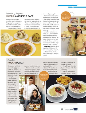 sombrero de paja toquilla. Campuzano cuenta que las preparación de bolones, bistec y otras delicias las aprendió gracias a su familia y especialmente a su mamá, quien le enseñó el valor de la comida montuvia manabita donde nunca faltan en el desayuno, el verde, café y la naranja. Amorfino Café estará en Raíces 2015 con bolones de queso, chicharrón y mixtos acompañados de bistec de carne y de hígado, y un rico café pasado. En el local también se venden tigrillos, tortillas, empanadas, muchines y tostadas. Dirección: Alborada sexta etapa, Mz. 670 diagonal al Centro Comercial La Rotonda. Atención todos los días, menos los martes de 06h00 a 12h00.