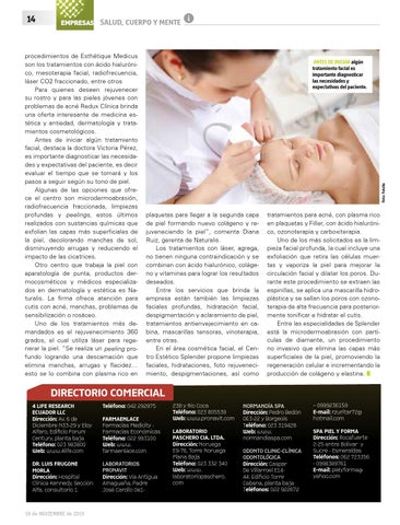 plaquetas para llegar a la segunda capa de piel formando nuevo colágeno y rejuveneciendo la piel”, comenta Diana Ruiz, gerenta de Naturalis. Los tratamientos con láser, agrega, no tienen ninguna contraindicación y se combinan con ácido hialurónico, colágeno y vitaminas para lograr los resultados deseados. Entre los servicios que brinda la empresa están también las limpiezas faciales profundas, hidratación facial, despigmentación y aclaramiento de piel, tratamientos antienvejecimiento en cabina, mascarillas tensoras, vinoterapia, entre otras. En el área cosmética facial, el Centro Estético Splender propone limpiezas faciales, hidrataciones, foto rejuvenecimiento, despigmentaciones, así como