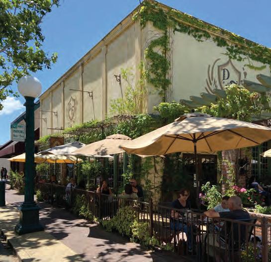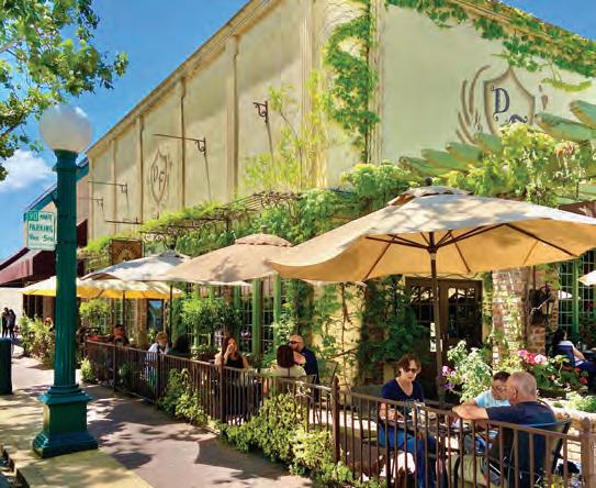wide brick paths, shaded during warm months by the leaves of tall trees. Outside tables are alive with conversation and the clink of glasses.
