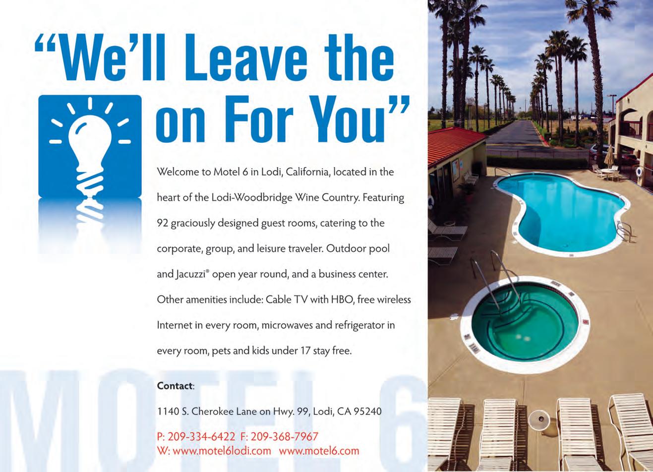 Welcome to Motel 6 in Lodi, California, located in the heart of the Lodi-Woodbridge Wine Country. Featuring 92 graciously designed guest rooms, catering to the corporate, group, and leisure traveler.