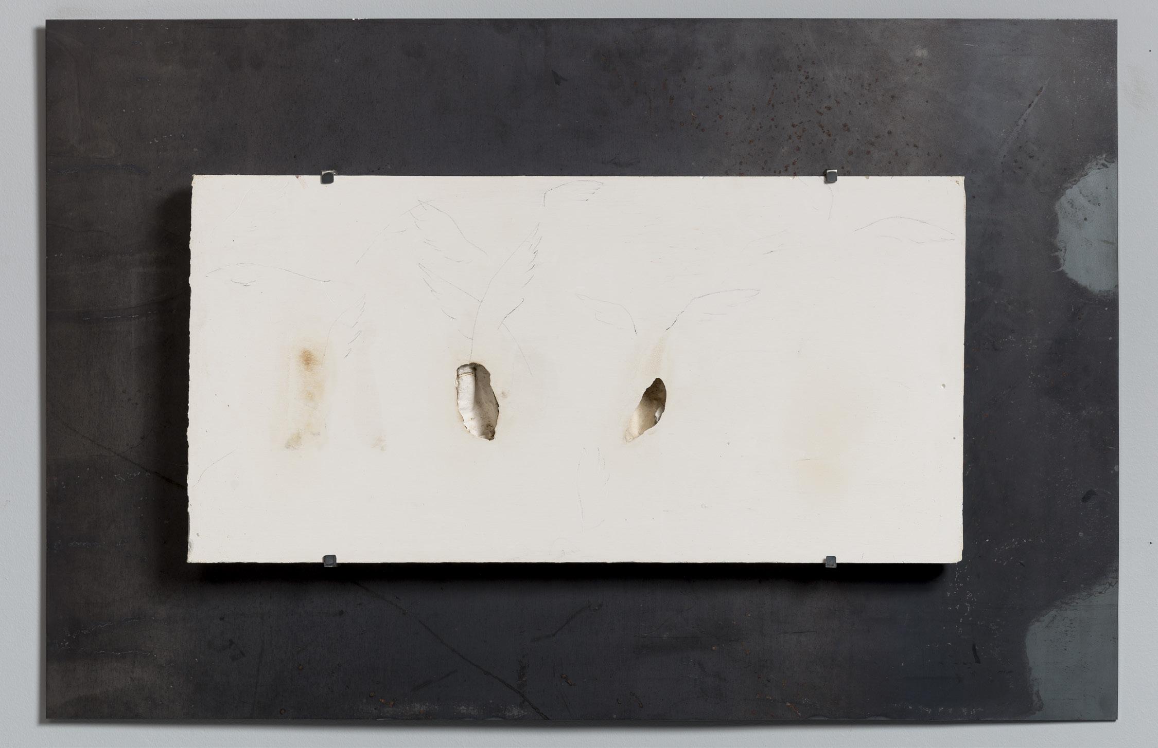 2017 steel, plaster, washi paper, ink, red iron oxide, pencil 27 x 37 x 1.5 inches