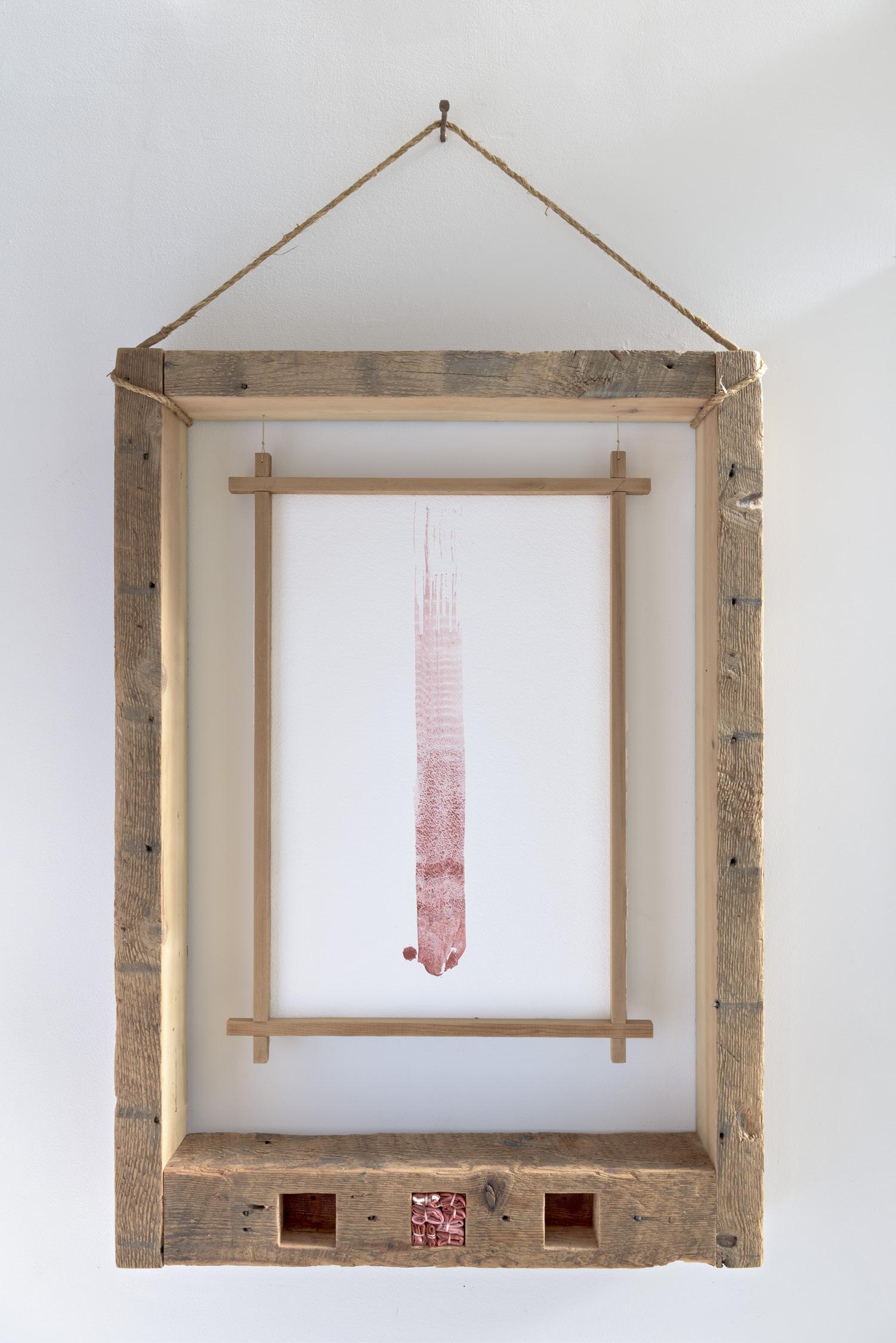 wood, paper, red iron oxide, silk, silk thread, rope
