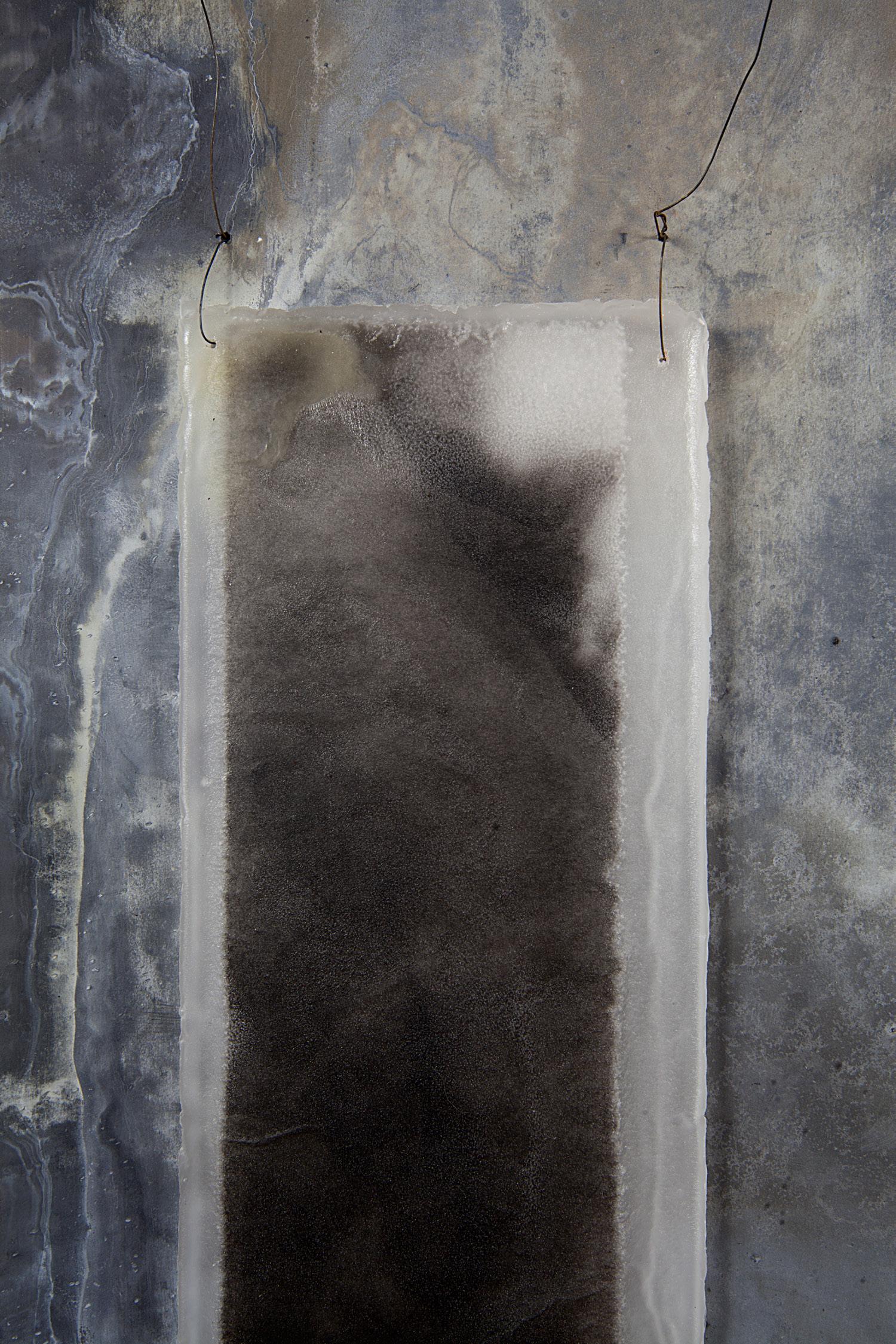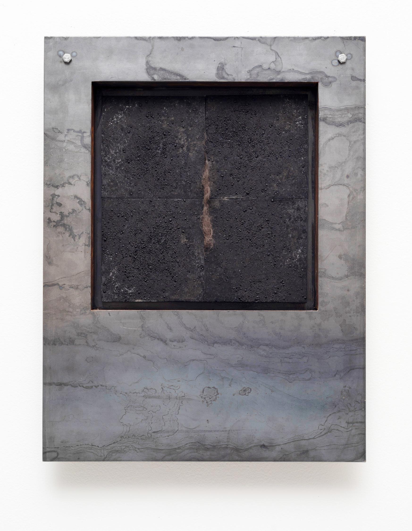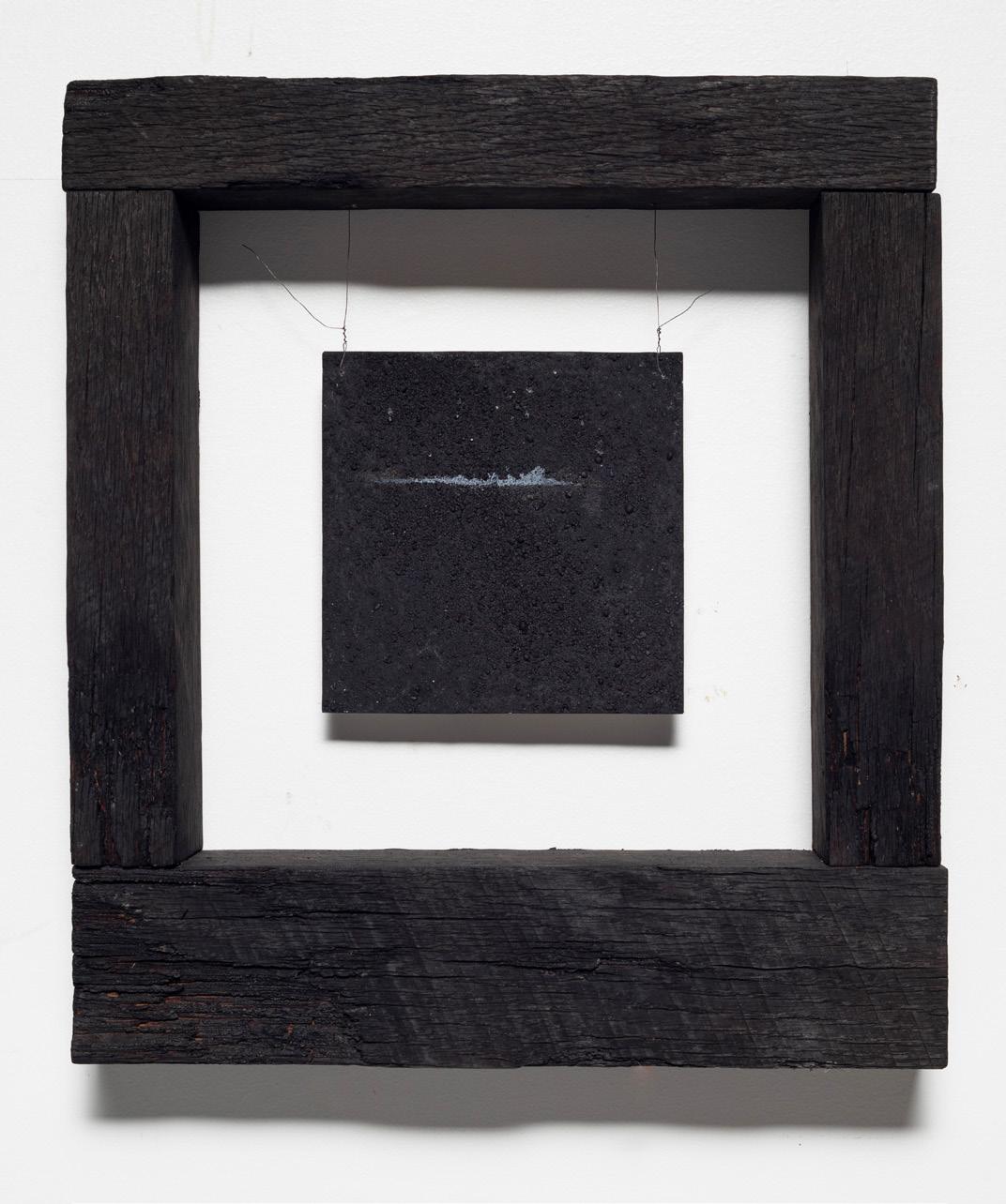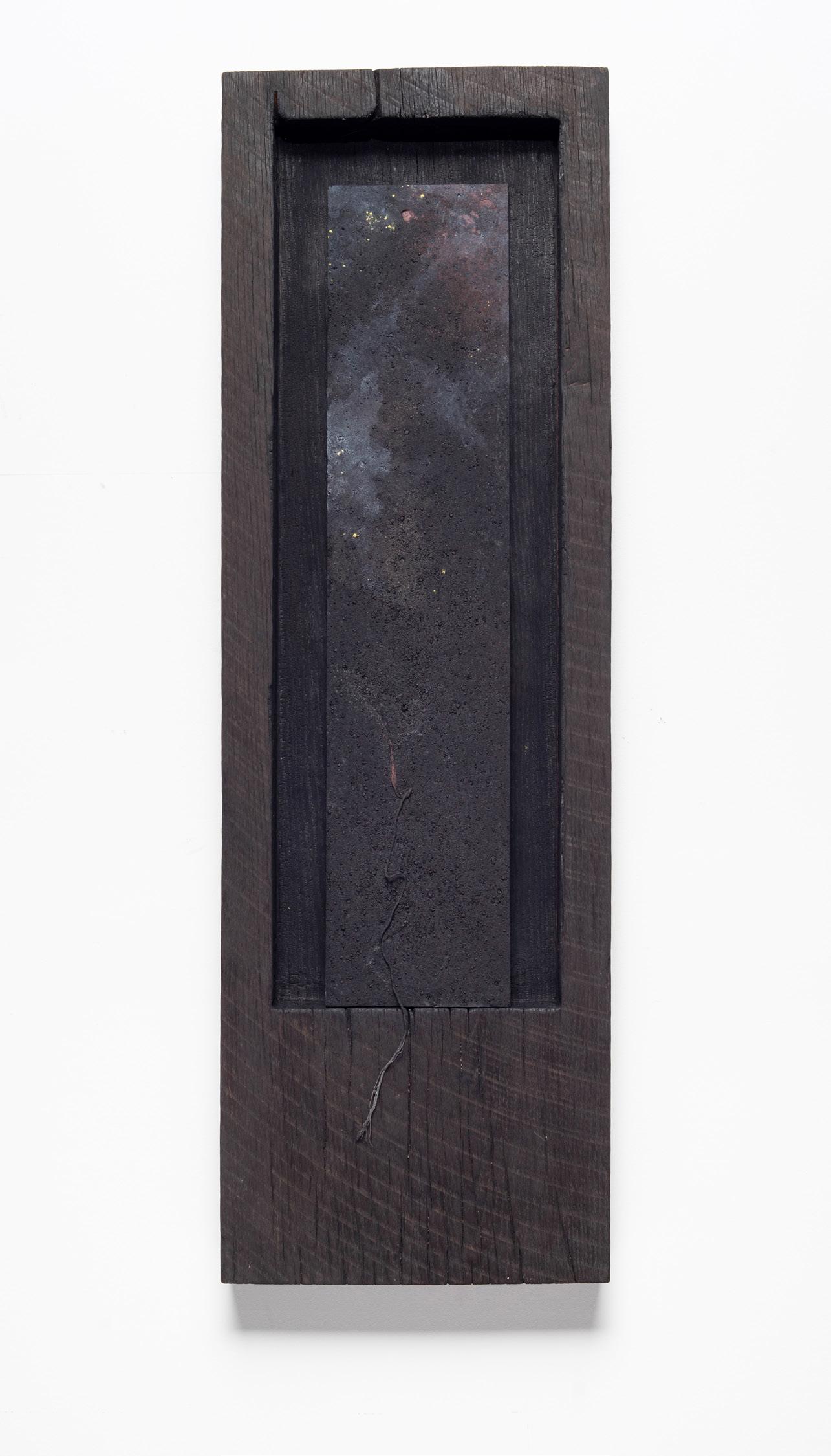 charred wood, plaster, black iron oxide, pigments, gesso, string