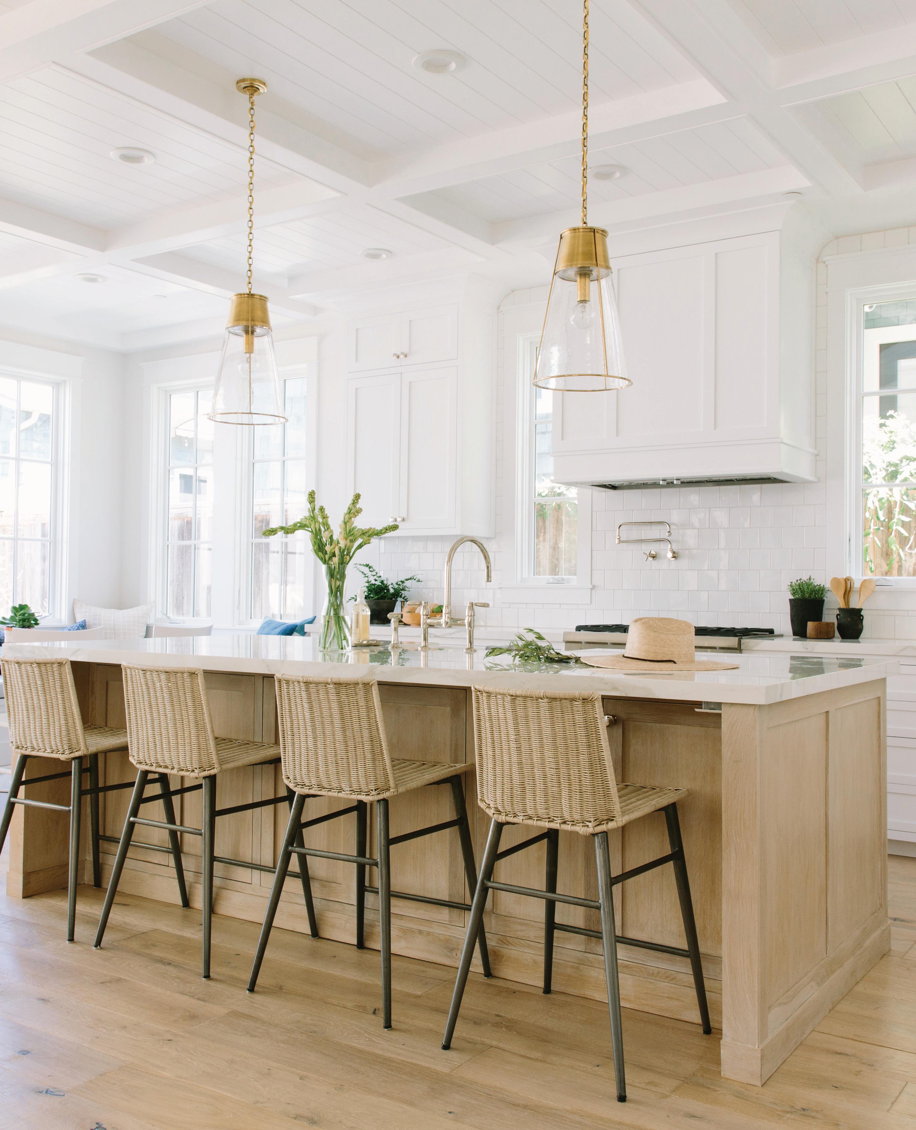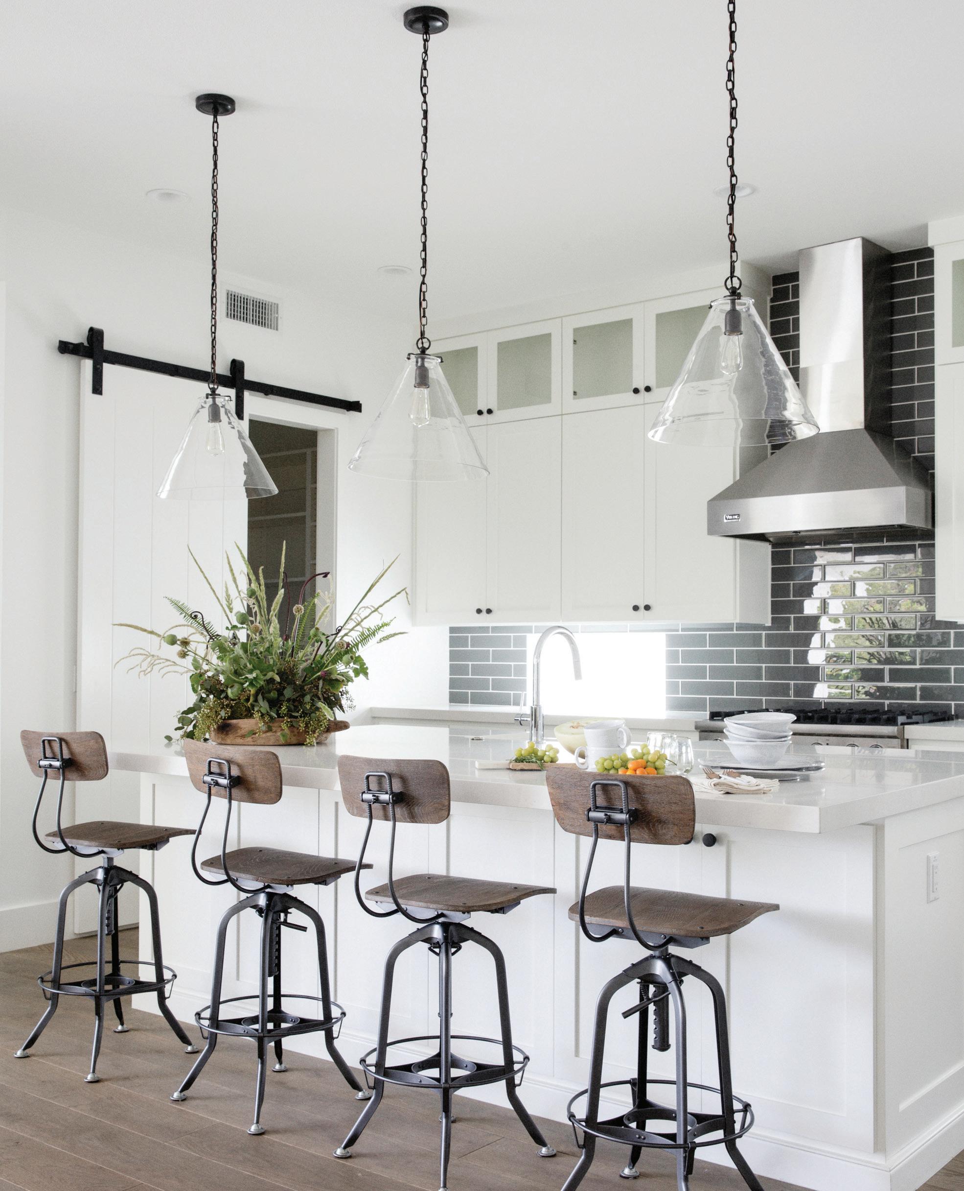 We recommend leaving 30"- 36" between the bottom of your fixture and the surface of your island. When installing multiple hanging lights over an island, the widest part of the fixtures should be spaced at least 30" apart.