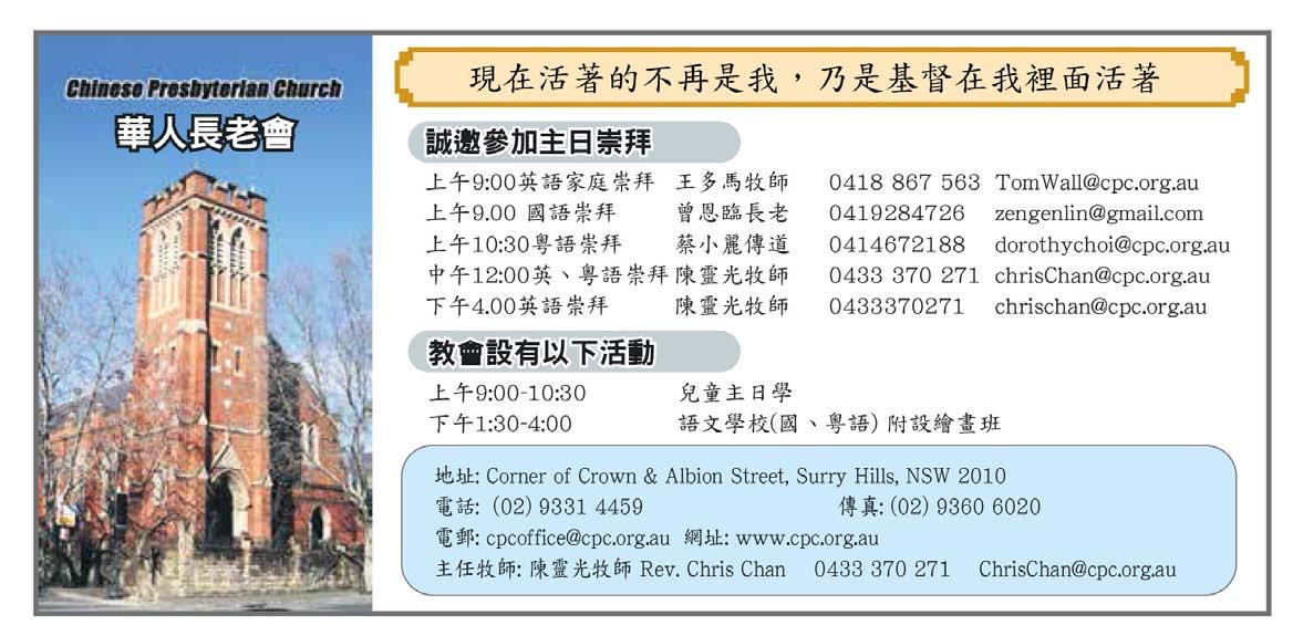 本刊所有文章、照片及插圖均保留版權。未經本月刊書面許可,不得以任 何形式轉載及翻印。本月刊文章由作者自負文責,其立論未必與本機構及 本月刊一致。贈閱刊物。所需費用少部份來自廣告收入,其餘由教會及個 人奉獻。