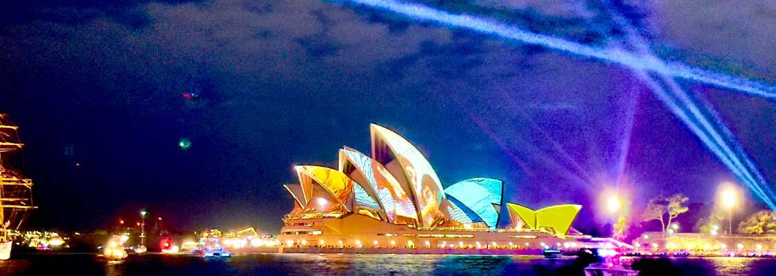 在夜幕降臨的雪梨港,城市的天際 線被光彩奪目的燈光和音樂藝術 作品點亮,這就是一年一度的“ Vivid Sydney” 燈光音樂節。在這個節日 裡,雪梨化身為一個巨大的藝術畫 布,無數的燈光裝置、音樂會和講 座,讓這座城市充滿了無窮的創意和 活力。
