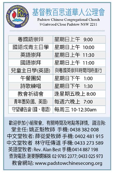 Rouse Hill Town Centre, 週日下午 2:00pm (華語崇拜) 連絡:陳傳道 (Kevin Chan) 0430 321 060 www.gracechristian.com.au/mandarin facebook.com/GCC.RouseHill